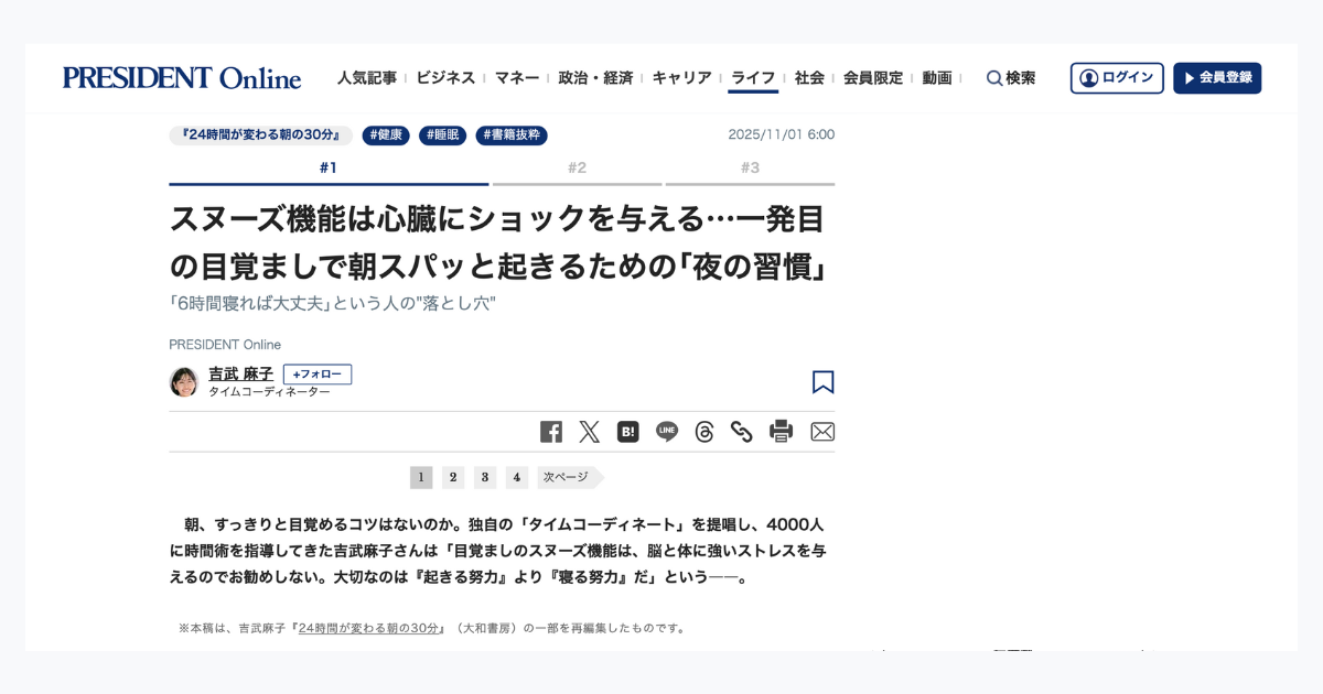 WEBメディア「PRESIDENT Online(プレジデントオンライン)」にて、弊社代表・吉武麻子の3冊目の著書「『時間がない!』から『余裕のある毎日』へ 24時間が変わる朝の30分」(大和書房)の内容をもとにした記事が3本掲載されました。
